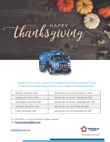 Residential Routes on Thursday and Friday will run one day later to allow Republic Services employees to celebrate Thanksgiving with their families.
